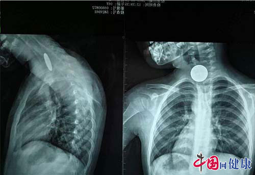 中国网健康讯 “医生,快看看我的孩子!”这么焦急的声音,到底发生了什么事?原来,11月27日上午11点,一个4岁的女孩独自玩耍时不小心吞下了一枚1元硬币,家长发现后立即将小孩送到柳州市人民医院急诊科就诊。在为女孩做了颈部和胸部的X光片检查后,医生发现硬币卡在女孩的食道中间的狭窄段(注:非进食状态下食道呈闭合状)。