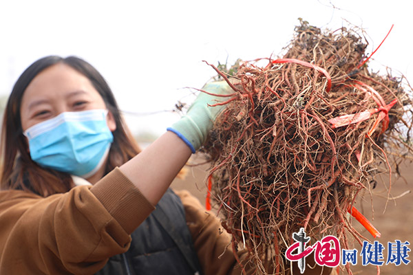 3月31日,在河北禾盛源生态农业科技开发有限公司育苗基地,工人在展示收获的丹参苗