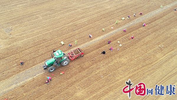 3月31日,在河北禾盛源生态农业科技开发有限公司育苗基地,大型机械在收获丹参苗(无人机照片)