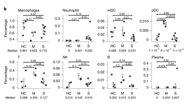 与中度感染者相比,重度/重度感染者的支气管肺泡灌洗液包含更高比例的巨噬细胞和嗜中性粒细胞,以及更低比例的mDC、pDC和T细胞。