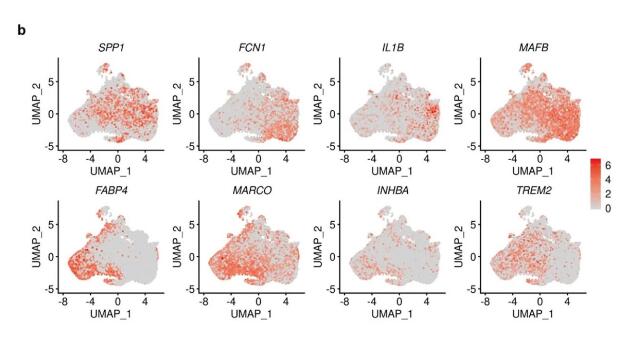 在不同细胞组中,巨噬细胞区室在FCN1,SPP1和FABP4的组成和表达上都存在很大差异:
