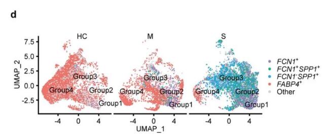 研究者根据按FCN1,SPP1和FABP4表达模式对巨噬细胞进行分组,将其分成4组: