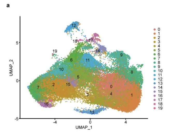 研究者重新聚类了20个巨噬细胞亚簇,以进一步剖析它们的异质性: