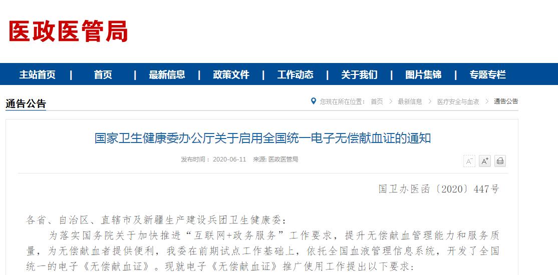 据国家卫健委网站今日消息,国家卫生健康委办公厅发布《关于启用全国统一电子无偿献血证的通知》(以下简称《通知》)。《通知》称,全国电子《无偿献血证》将于2020年6月14日“世界献血者日”正式上线运行,登陆查询平台包括国家卫生健康委官网、中国政府网、国家政务服务平台和支付宝、微信、百度小程序。