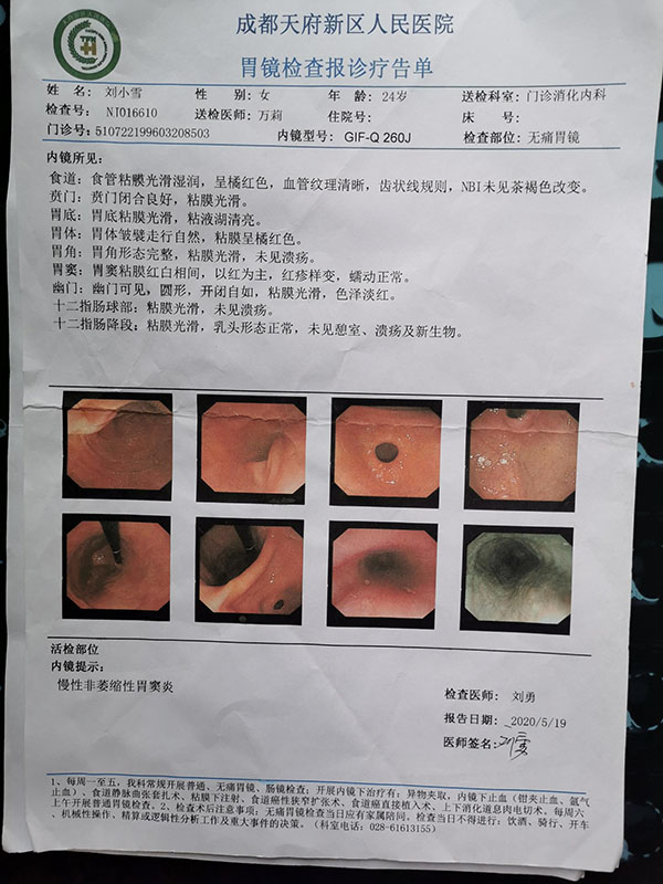 “死神辣条”的后遗症是,至今只要空腹时,刘小雪就会有痛感,有时甚至无法入睡。5月19日,刘小雪前往天府新区人民医院进行复查,被诊断为慢性非萎缩性胃窦炎。