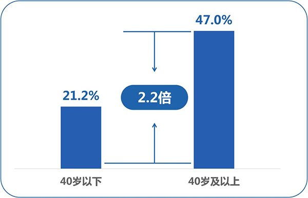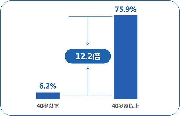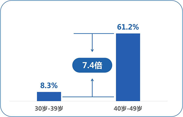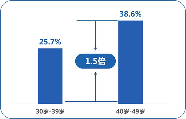 黄斑部异常在40岁-49岁人群的检出率为38.6%,是30岁-39岁人群黄斑部异常检出率(25.7%)的1.5倍。