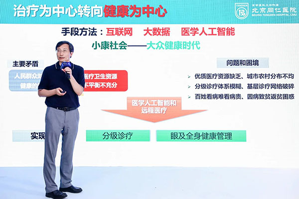 眼健康精准预防是关键。人工智能在医疗领域的应用越来越成熟,首都医科大学附属北京同仁医院副院长魏文斌在演讲中向大家分享:“眼健康在中国是一个非常严峻的问题,随着人口的老龄化,和眼病慢病的年轻化,眼健康越来越重要。眼健康也是全身健康的重要一部分,高血压、糖尿病等都与眼健康息息相关,通过眼睛可以看全身的健康,看心脑血管的危险程度。有了人工智能和信息学的应用,早期筛查、早期干预和长期监管才能真正的落实,才能针对不同人群做到个性化和精准化的健康管理。”