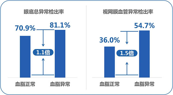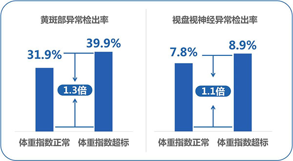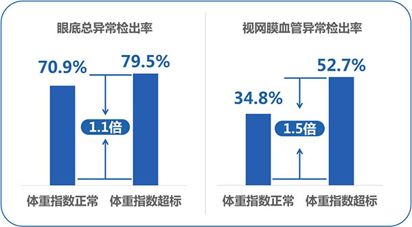 蓝皮书中将高血压、糖尿病、糖尿病前期、血脂异常、体重指数超标与眼底健康进行了综合分析,数据显示:高血压、糖尿病、糖尿病前期、血脂异常、体重指数(BMI)超标人群眼底异常检出率均高于总样本人群。三高一胖人群眼底健康问题更需引起关注。