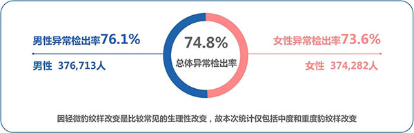 他针对2018年5月开始到2020年7月期间参与人工智能眼底照相疾病风险评估的体检者进行了分析,涵盖全国23个省级行政区共1,003,585人,整体异常检出率为74.8%,且男性异常检出率高于女性,眼底健康问题更为严重。超七成人群存在眼底异常。