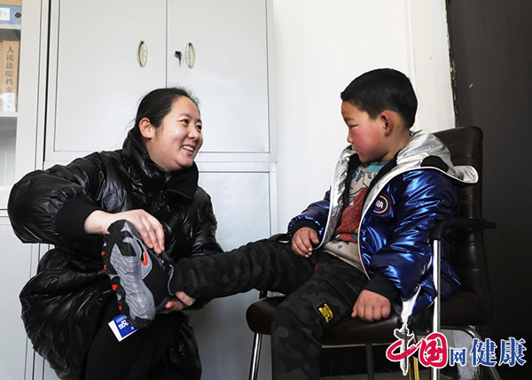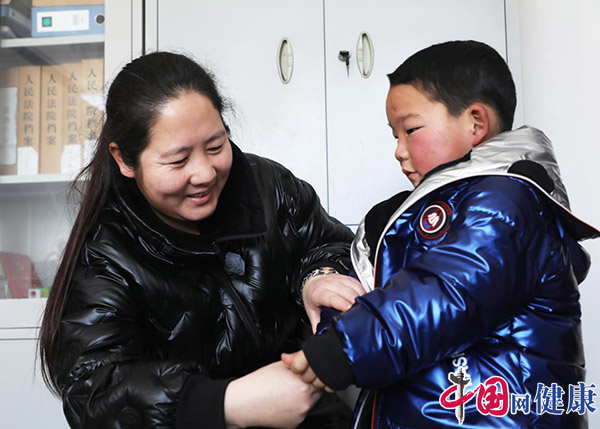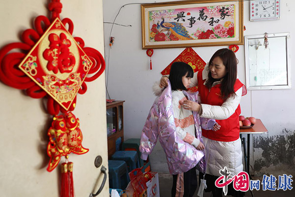 志愿者常丽丽帮贫困儿童试穿羽绒服
