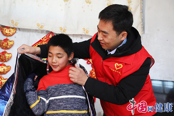 志愿者薄涛帮贫困儿童试穿羽绒服