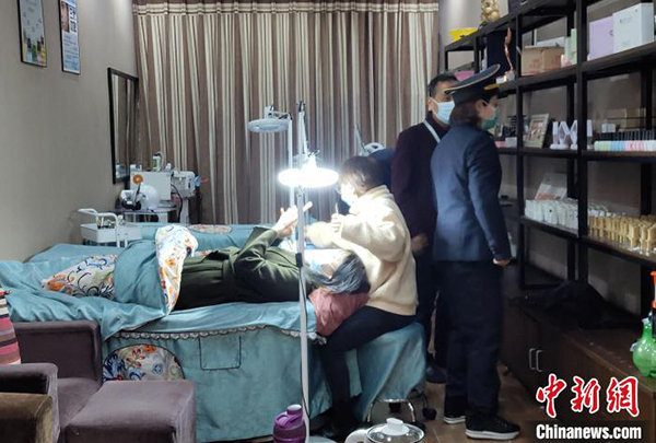 成都市卫生计生监督执法支队工作人员检查一美容店。 王鹏摄