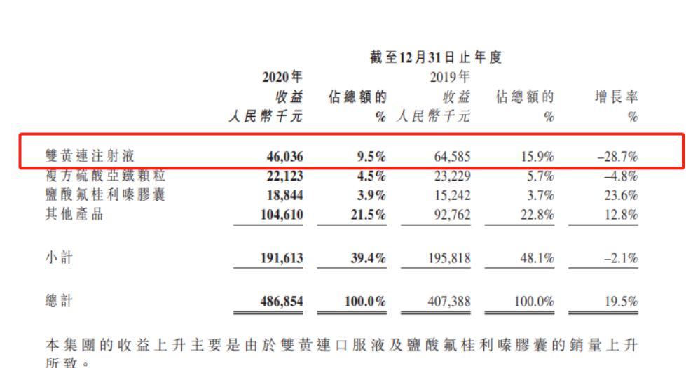 据悉,双黄连注射液为福森药业核心产品。据福森药业《2020年年度报告》,2019年度,其双黄连注射液收益64585000元,占公司总额15.9%;2020年度,其双黄连注射液收益46036000元,占公司总额9.5%。