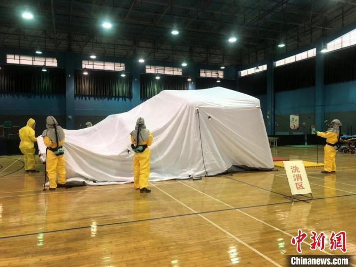应急队员正在搭建洗消帐篷 廖温勃 摄