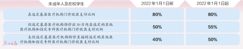 “两个办法”提高了未成年人及在校学生的普通门诊报销比例。2022年1月1日起,经选定基层医疗机构转诊后30日内就医的由统筹基金支付的金额比例由原来的50%提升至55%,同时调整了参保人员大病保险资金的支付比例。此外,新办法还允许广州市高层次人才未就业的配偶及其子女等成员参照本办法执行。新办法自印发之日起施行,有效期5年。
