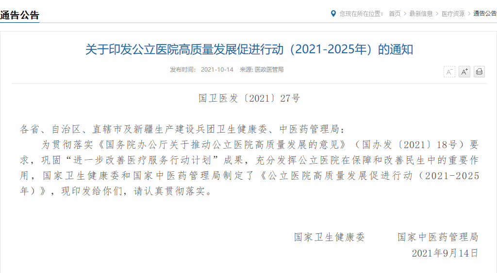 “十四五”时期公立医院高质量发展这么干!两部门发文明确八项行动