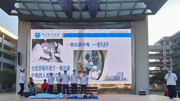 活动中,医护人员携急救箱、一氧化碳碳氧检测仪、氧气枕和担架登上讲台,通过现场分段模拟演示及PPT讲解相结合的形式展现发生多人一氧化碳中毒时,应该如何进行呼救与急救。