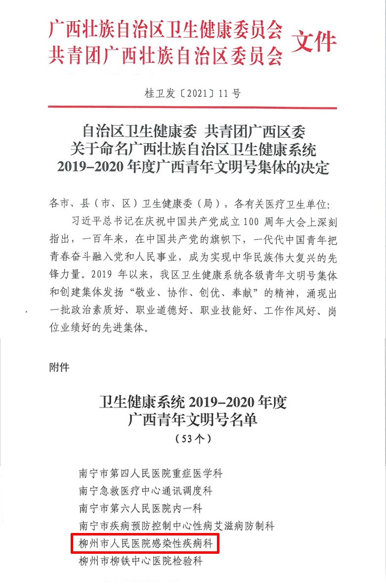 近日,广西自治区卫生健康委、共青团广西区委联合印发《自治区卫生健康委共青团广西区委关于命名广西壮族自治区卫生健康系统2019-2020年度广西青年文明号集体的决定》,柳州市人民医院感染性疾病科获评2019-2020年度广西“青年文明号”先进集体。
