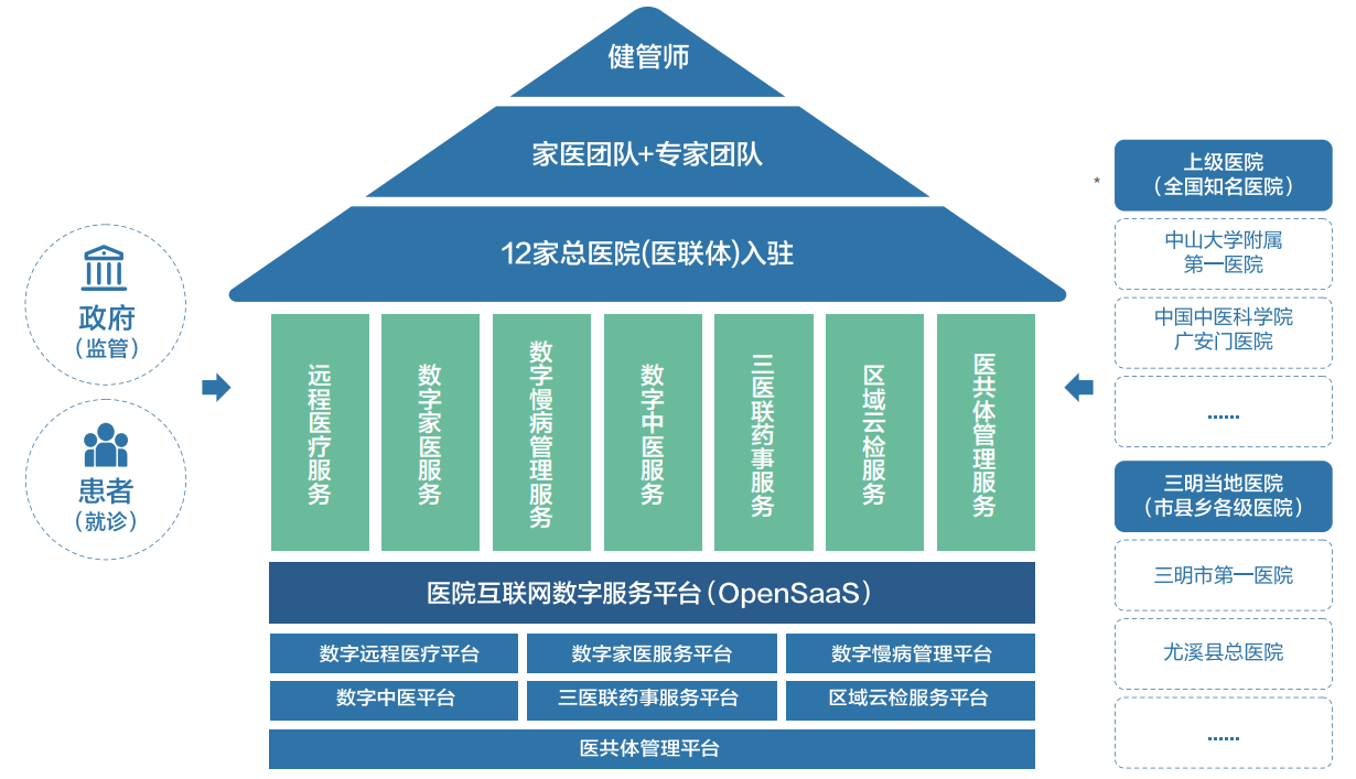依据该方案,三明引进国内最大的数字医疗平台微医,搭建全市统一的“医院互联网数字服务平台”,使其服务于12家总医院(医联体)及其成员单位,以实现三明数字医疗健康服务“全联全通”,为三明构筑数字健共体打好基础。