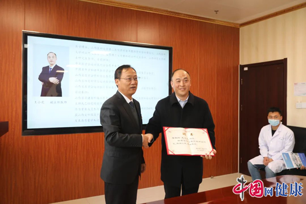 黄新升向王小虎颁发科研教学副院长聘任书。
