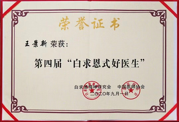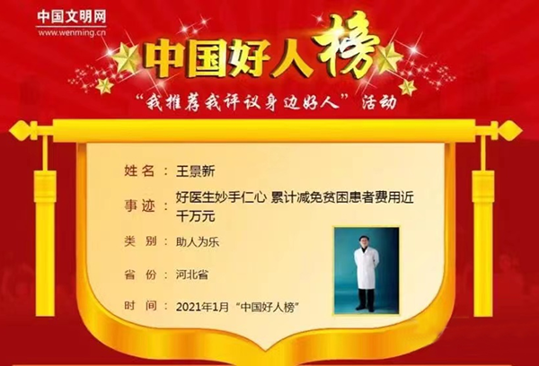 2018年12月,王景新荣获“邢台好人”。2019年4月荣获“河北好人”,同年被评为石家庄市道德模范。2019年被选为石家庄市第十三届人大代表。2020年评为“白求恩式好医生”。2021年,荣登“中国好人”榜。(远望 邓迪思)