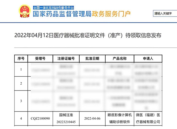4月13日,国家药品监督管理局发布新一批医疗器械准产获批名单,微医“眼底影像计算机辅助诊断软件”名列其中,成为继硅基智能、鹰瞳科技等企业的糖尿病性视网膜病变产品之后,
