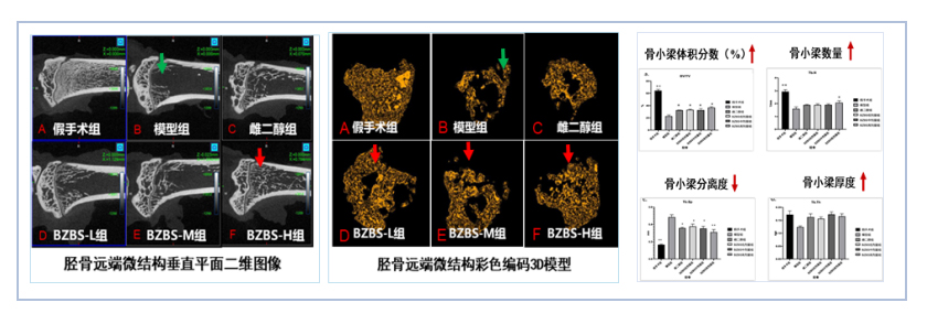 性激素水平降低会引发骨质疏松,特别是绝经期的女性。研究发现,采用双侧卵巢切除建立大鼠早衰模型,给予八子补肾或雌激素。模型组小鼠的骨密度显著降低,骨小梁体积分数、数量和厚度降低,骨小梁分离度增加;而八子补肾组的骨密度有不同程度改善,表明八子补肾胶囊可以促进骨合成,抑制骨分解,提高骨强度,增加骨密度。