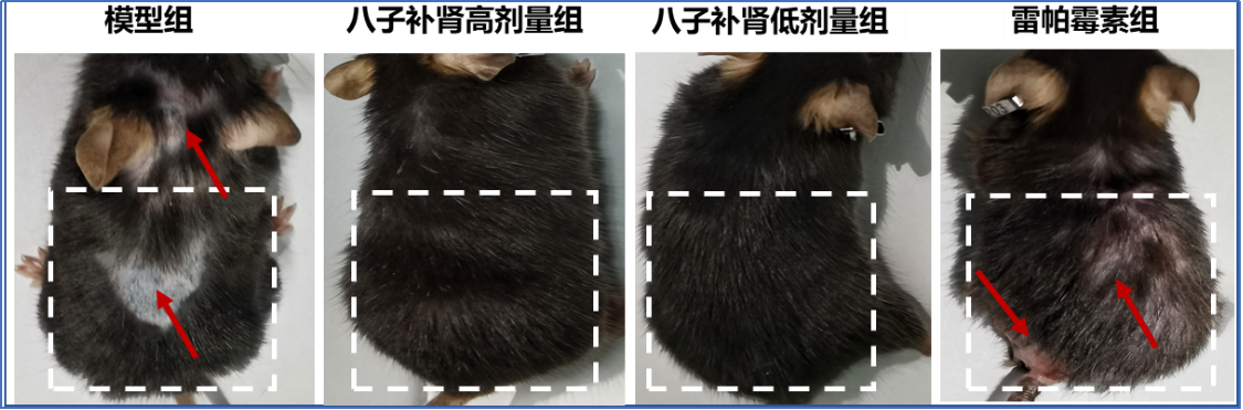 脱发和须发变白是最明显的衰老表现。此前有研究显示雷帕霉素有抗衰老作用,最新实验将八子补肾胶囊与雷帕霉素对比研究显示,对13月龄(约相当于人的52岁)小鼠给予八子补肾或者雷帕霉素,2个月后(15月龄,约相当于人的55周岁),模型组小鼠脱毛、毛发变白现象明显,精神状态不佳,活动减少;雷帕霉素组小鼠也有不同程度脱毛,且毛色的光泽较差;八子补肾组小鼠皮毛黑亮浓密,精神状态良好,活动正常,显示出八子补肾胶囊具有良好的抗衰老作用。