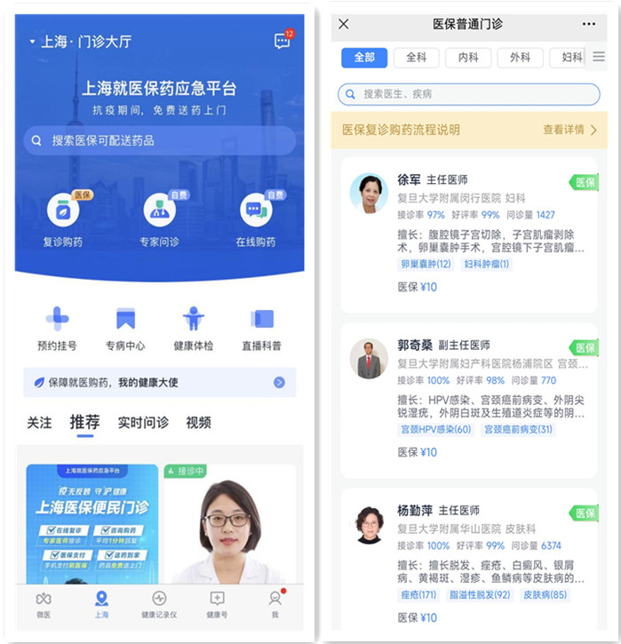 随着上海市疫情防控形势持续趋稳,平台也进行了常态化功能的适应性升级迭代。目前身处上海地区的用户,只需打开“微医”APP,就能快速进入“上海门诊大厅”,点击医保复诊购药,能够清楚地看到医生的在线状态,可以实时向医生问诊。在激活电子医保凭证后,填写复诊信息并上传2个月内有效处方,就可进行在线医保复诊购药。疫情期间,平台还提供了免费送药上门服务。