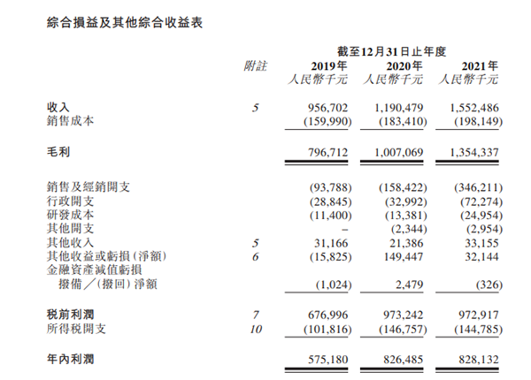 数据显示,2019年-2021年,巨子生物的营收分别为人民币 9.57亿、11.90亿和 15.52亿元,净利润分别为人民币 5.75亿、8.26亿和 8.28亿元,净利率分别为60.1%、69.4%及53.3%。