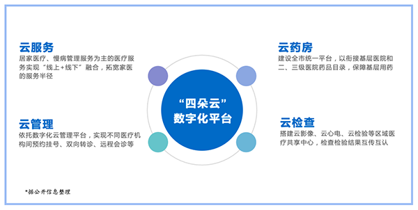 基于在基层医院落地统一的云管理、云服务、云药房、云检查“四朵云”平台及线下标准化的慢病管理中心,健共体正通过逐病种的标准化诊疗、集约化云药房、集约化云检查,为居民提供线上线下一体化的医疗健康服务。