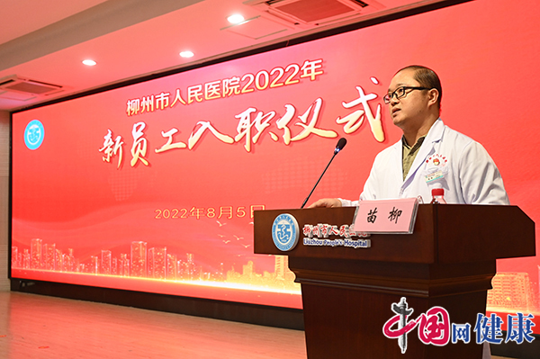心血管内科党支部副书记、副主任苗柳博士作为老员工代表进行发言,他向年轻人的到来表示热烈欢迎。他讲到,柳州市人民医院传承近百年的精神激励着一代又一代的柳人医人为之不断奋斗,勇攀高峰,相信有了你们的加入,柳人医的明天将会更加美好。路漫漫其修远兮,新员工在未来的工作中,要秉承博学而后成医,厚德而后为医,谨慎而后行医的理念。勤学苦练、开拓进取,让医院的高质量发展之路更加蹄疾步稳、再创辉煌!