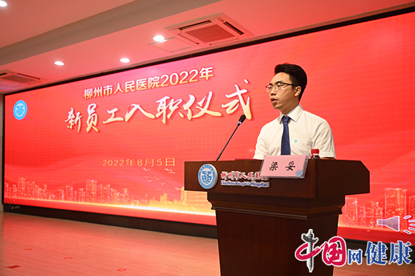 脊柱外科梁妥博士代表所有新员工感谢医院为大家提供实现人生理想的舞台,同时感谢医院提供的宝贵培训机会,能够更快完成从学生到医生的角色转换,更快进入高效工作状态。在柳州市人民医院,有团结上进的团队,有共同奋斗的目标,前辈们取得的辉煌成果对我们既是鼓励、更是鞭策,我们一定会肩负起关爱生命,呵护健康的责任,与医院共同发展,共同成长。