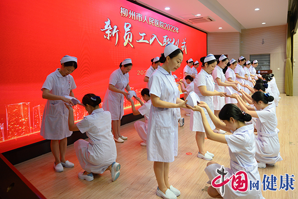 在仪式激动人心的时刻,医院领导为新入职的医生、医技人员进行授衣,护理前辈为新入职的护士进行授帽。大家的脸上都写满了自豪,从今天开始,他们真真正正成为了柳人医大家庭的一员。