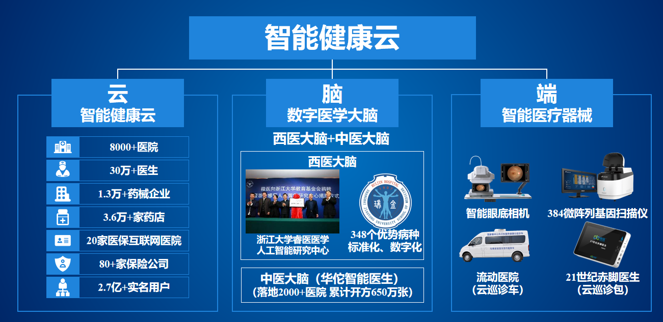 依托于丰富的医疗资源积累以及数字化研发能力,微医开发智能健康云、数字医学大脑、智能医疗器械“云+脑+端”数字智能化医疗服务体系。
