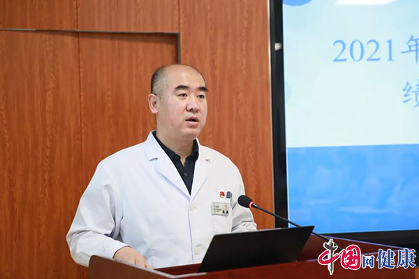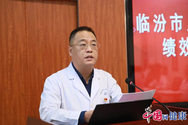 副院长王铁忠从总体情况、具体数据、2022年年度目标三个方面对临汾市人民医院2021年度国家三级公立医院绩效考核结果进行了详细分析。