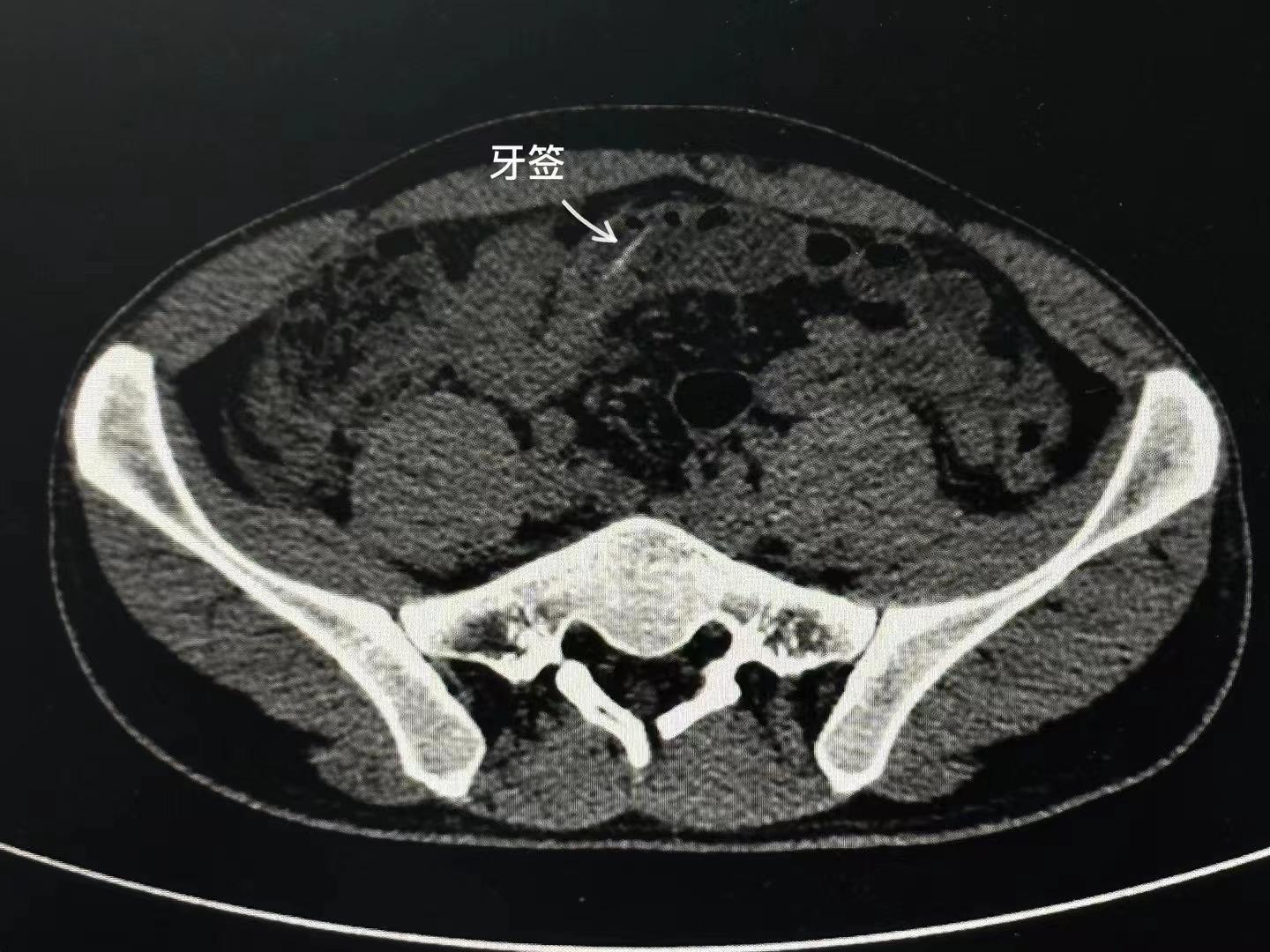 柳州市人民医院急诊科的医生接诊了小张。经复查CT,医生在小张的肠道内看到一根异物。凭借多年的诊疗经验,医生初步判断异物为牙签。