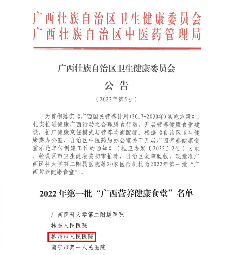 近日,自治区卫生健康委公布了2022年第一批“广西营养健康食堂”名单,柳州市人民医院榜上有名!