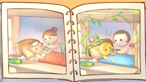 基于产品的功效与品牌调性,999小儿感冒药从外包装提取了小树苗的元素,创作了一个拟人化的卡通形象。“小树苗”体现的是产品的中药草本成分,治愈的手绘画风体现产品的温和性以及999品牌一如既往的温情调性。沟通IP呈现了两个角色:感小苗&感妈妈。他们身上皆有的“爱心”象征的是母亲与孩子之间的陪伴与爱意,也是一种代际间的延续与关联。简单的笔画,传递着丰满的感情,三九不愧是OTC情感营销之王。