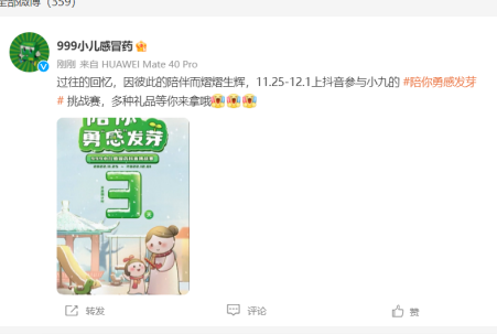 除此之外,999小儿感冒药在抖音、微信、微博等多平台进行创意内容传播,多维度构建内容生态,为挑战赛活动集中导流,实现了跨平台内容营销。