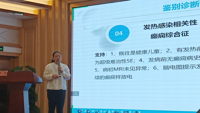 本次病例比赛的参赛单位来自南宁、柳州、桂林、百色、梧州等各大医院。比赛中,她讲述了一位13岁的健康女孩,突然出现发热和频繁抽搐,从当地卫生院转至柳州市人民医院儿科,患儿住院期间出现了持续癫痫状态,儿科团队通过周密检查,抽丝剥茧,最终确诊为发热感染相关性癫痫综合征。