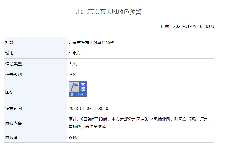 据北京气象局网站消息,2023年01月05日16时30分,北京市气象台发布大风蓝色预警。