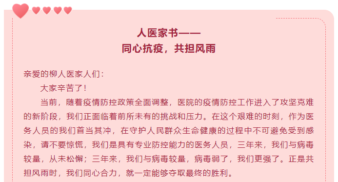 在这段特殊时期,很多前来就诊的患者看到医护人员的工作状态,也都送出了恳切的关心和衷心的感谢,他们的理解、信任和关怀是柳人医人前进的动力。
