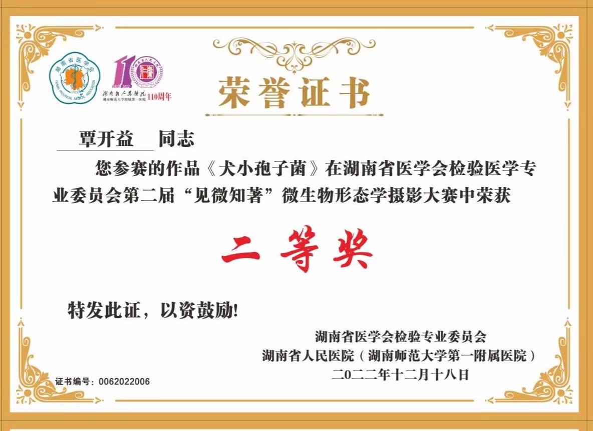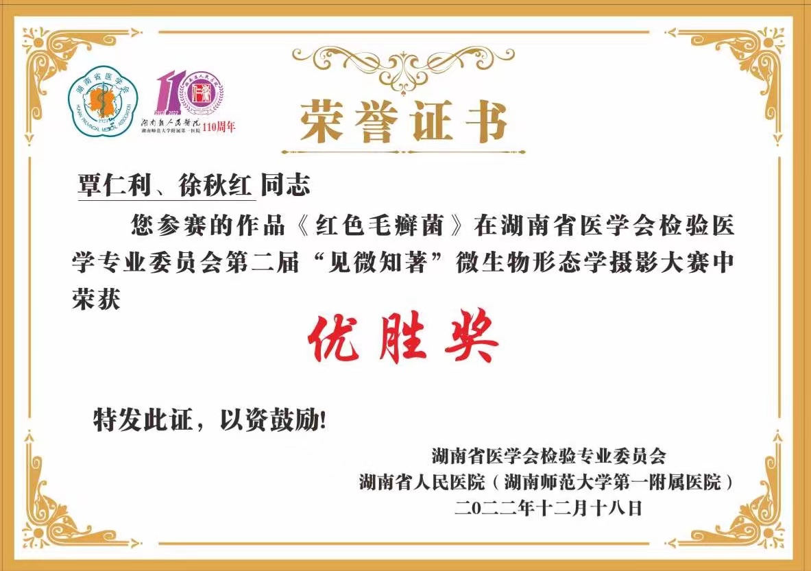 本次“临床微生物学诊断与前沿学习班”还设有“见微知著”微生物形态学摄影大赛环节。医院医学检验科微生物组多名医务人员参与了摄影大赛。经过层层筛选,柳州市人民医院医学检验科在全国众多参赛作品中脱颖而出,斩获佳绩,覃开益主管技师的《犬小孢子菌》荣获二等奖,黄春兰副主任技师、马丽梅副主任技师的《创伤弧菌》以及覃仁利主管技师、徐秋红副主任技师的《红色毛癣菌》荣获优胜奖。