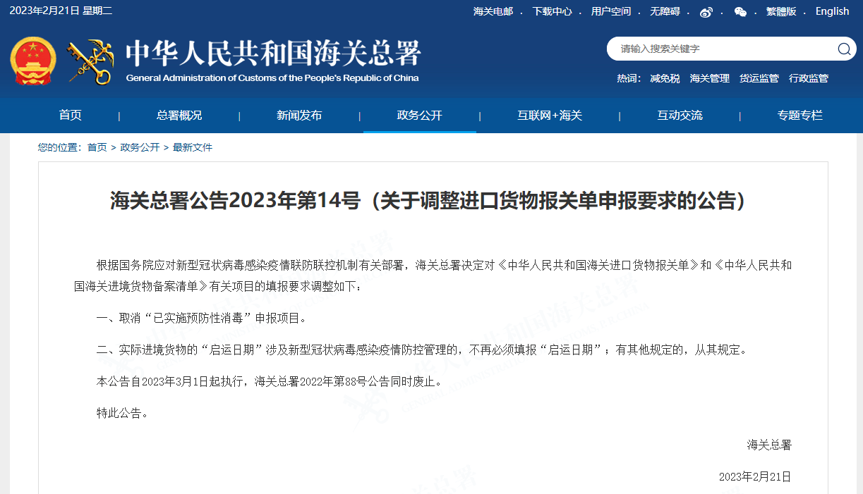 海关总署:调整进口货物报关单申报要求,取消“已实施预防性消毒”申报项目