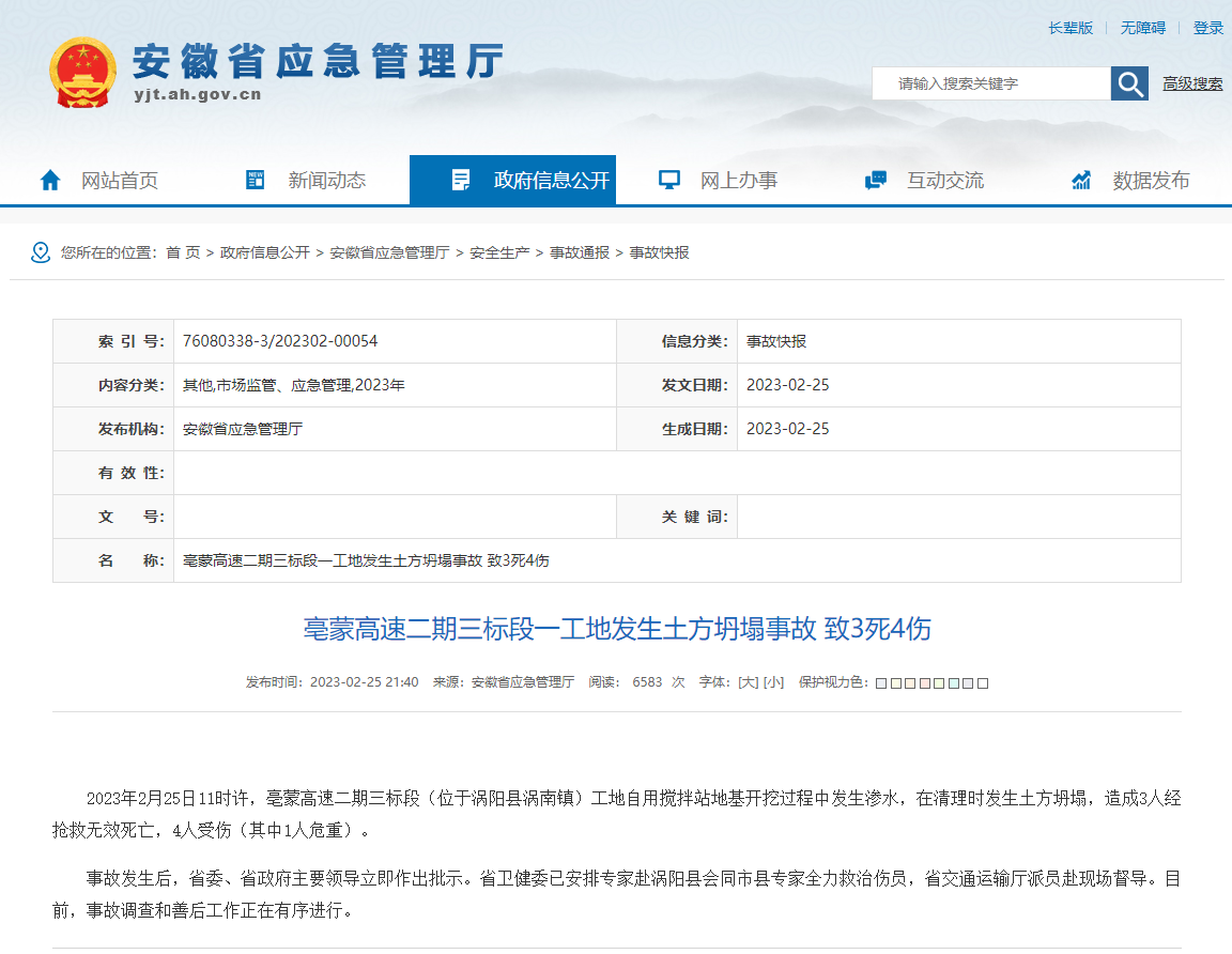 安徽应急管理厅:亳蒙高速一工地发生土方坍塌事故,致3死4伤