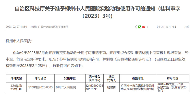 2023年2月27日,广西自治区科技厅公布了关于准予柳州市人民医院实验动物使用许可的通知,柳州市人民医院实验动物中心顺利通过验收,成为广西首家获颁实验动物使用许可证的市级综合医院。