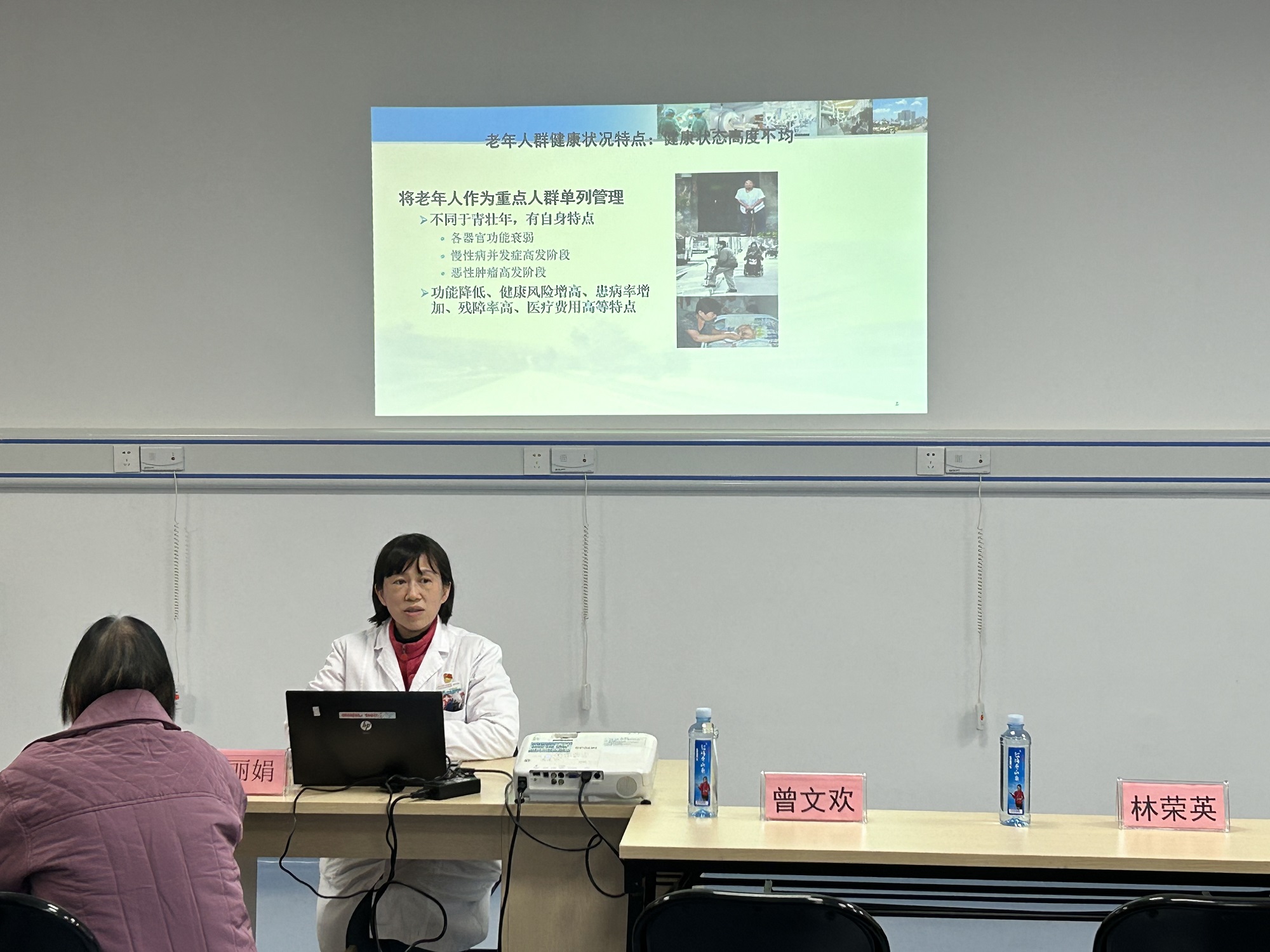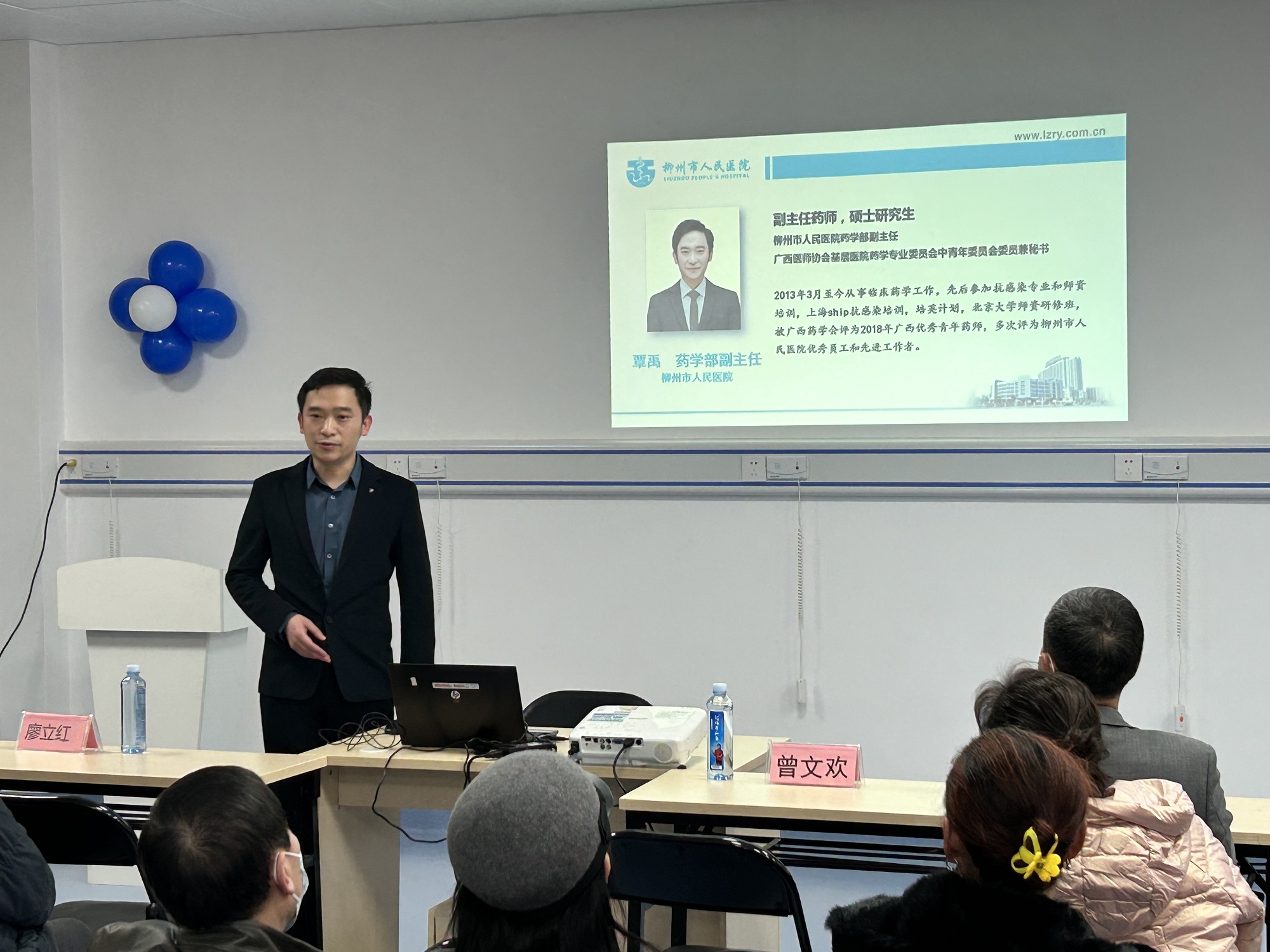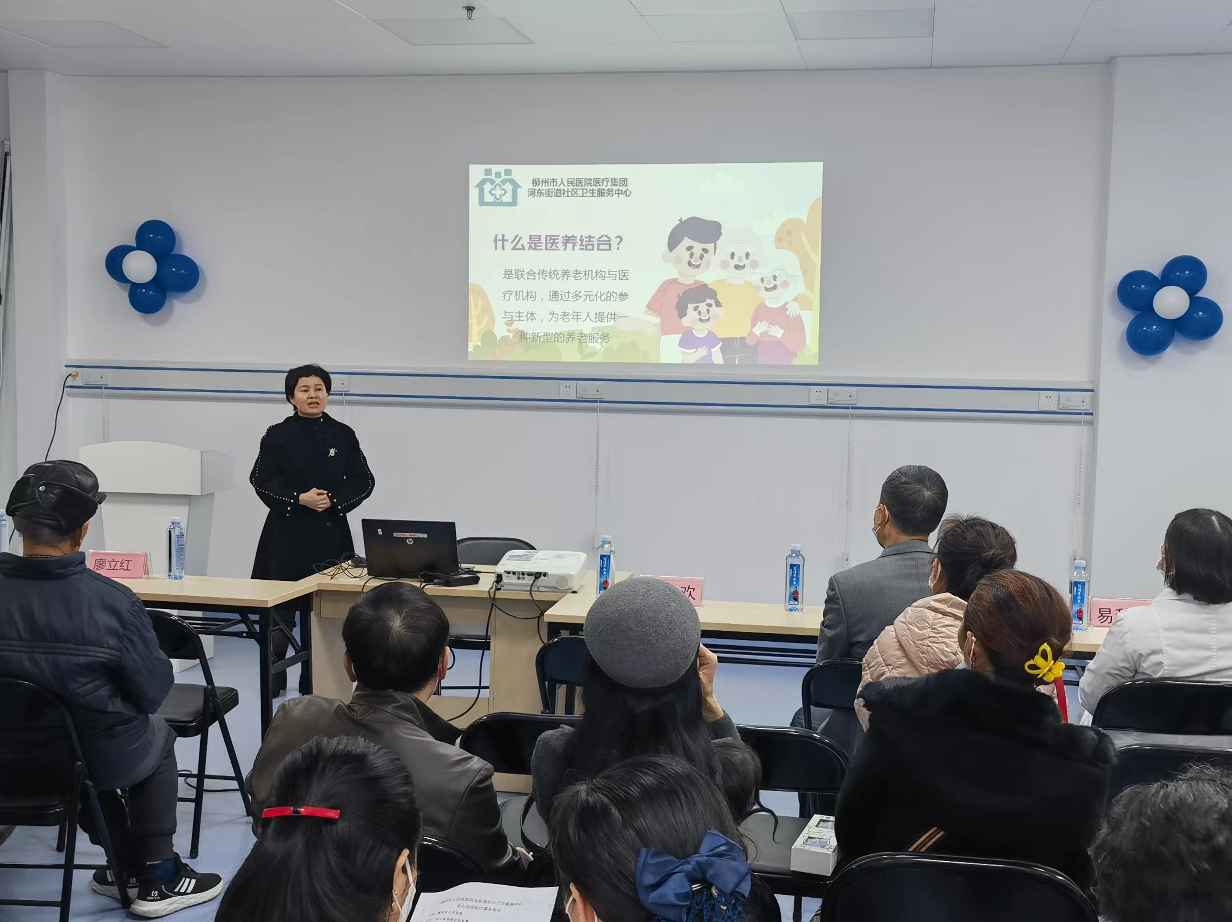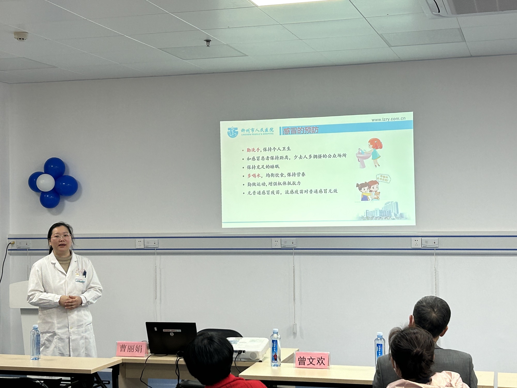 上,柳州市人民医院医疗集团潭中院区副院长兼河东街道社区卫生服务中心廖立红主任、健康服务中心唐勇主任介绍了安心门诊的服务项目,柳州市人民医院药学部覃禹副主任致辞并进行药品使用说明书适老化调查研究解读,药学部副主任药师李俊明针对高血压进行用药指导并介绍家庭药师的服务项目,副主任药师曹利娟针对呼吸系统疾病对老年人进行用药指导和健康宣教,全科医学科副主任易秋艳介绍了老年人健康管理与照护注意事项。