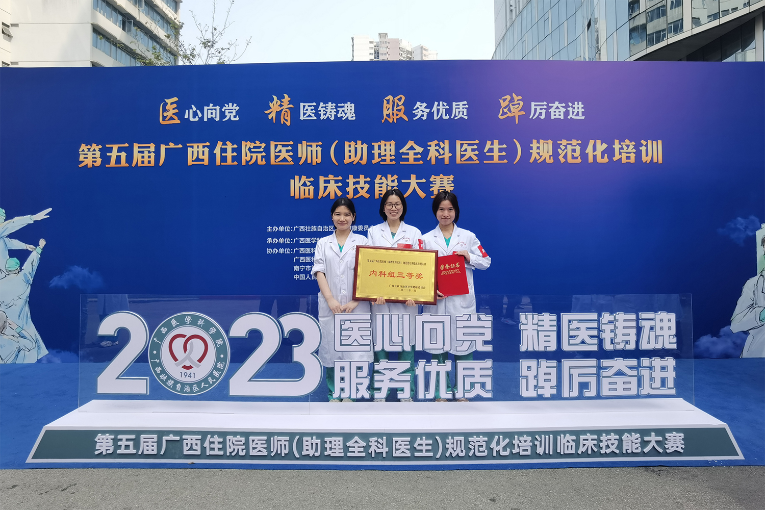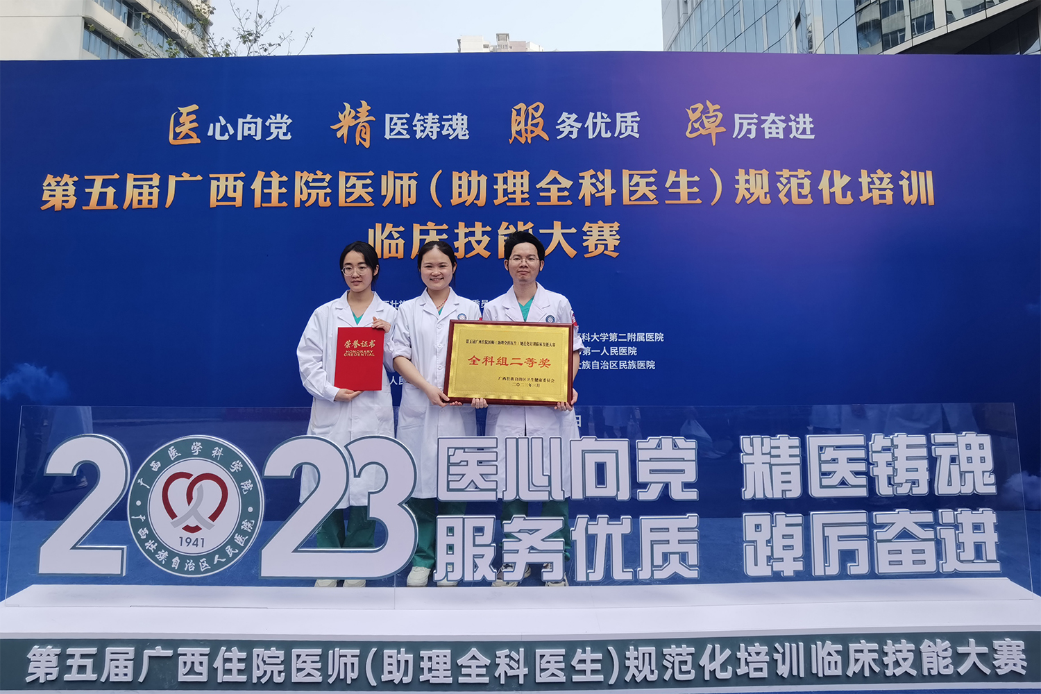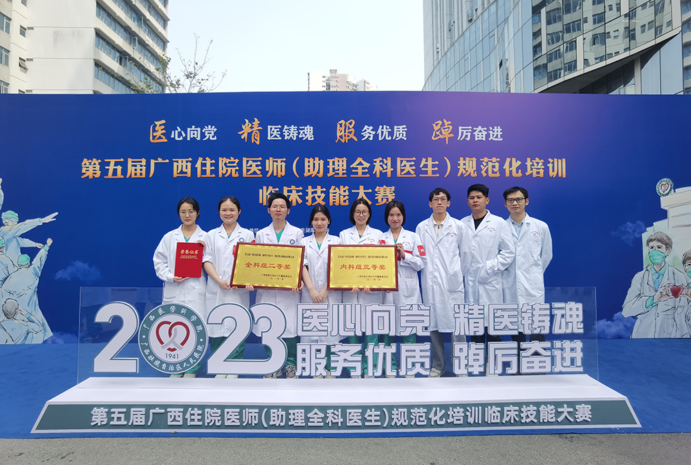 2023年3月2日-4日,以“医心向党 精医铸魂 服务优质 踔厉奋进”为主题的第五届广西住院医师(助理全科医生)规范化培训临床技能大赛在南宁广西壮族自治区人民医院圆满落下帷幕。柳州市人民医院内科组、外科组、全科组3支代表队与区内54家培训基地101支队伍、303名住院医师同台竞技,其中全科组代表队荣获二等奖,内科组代表队荣获三等奖,全科组住院医师覃颖荣获最佳选手。
