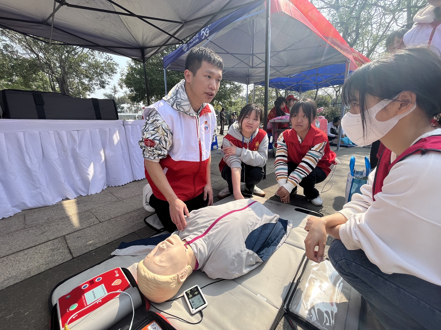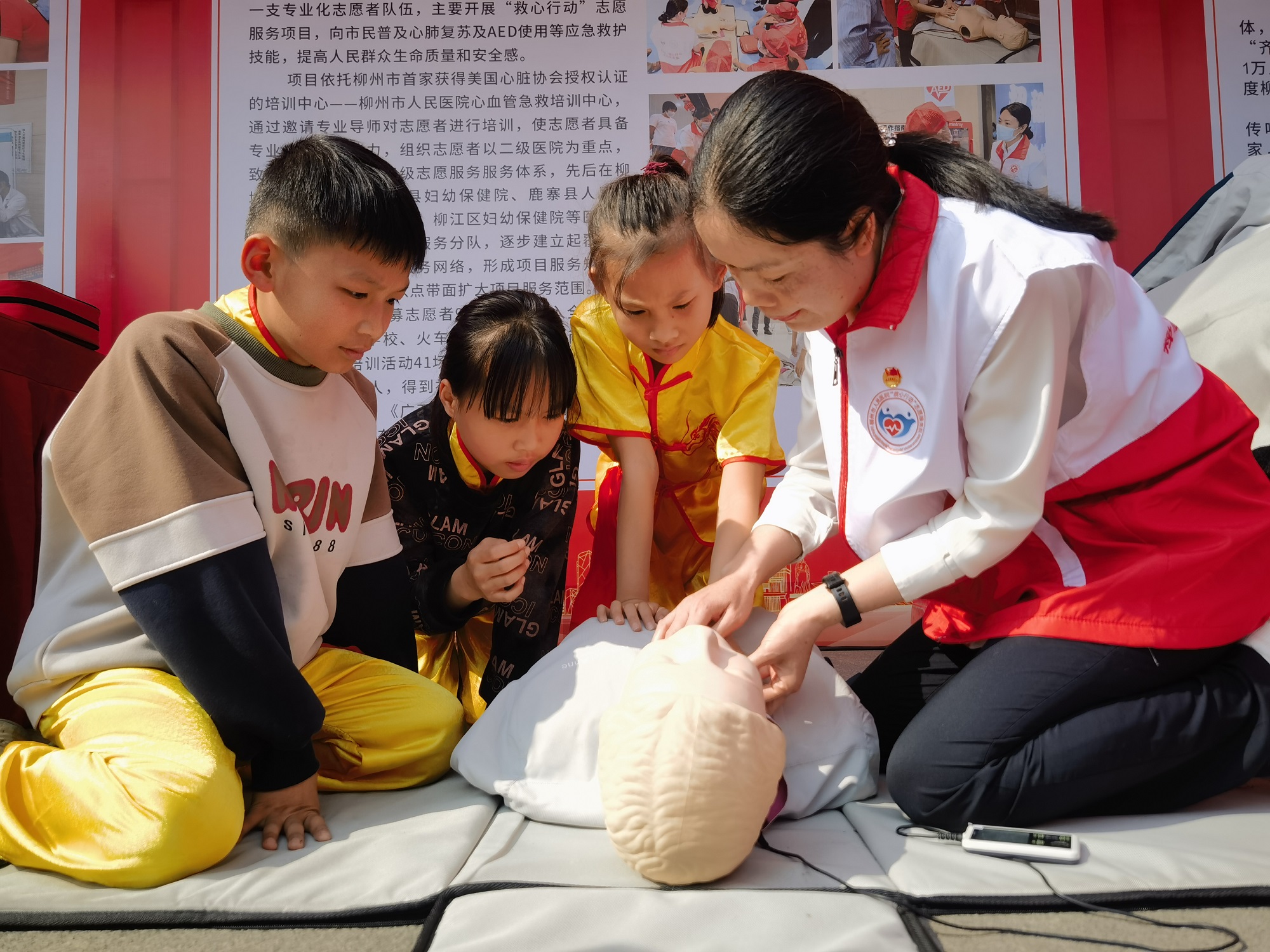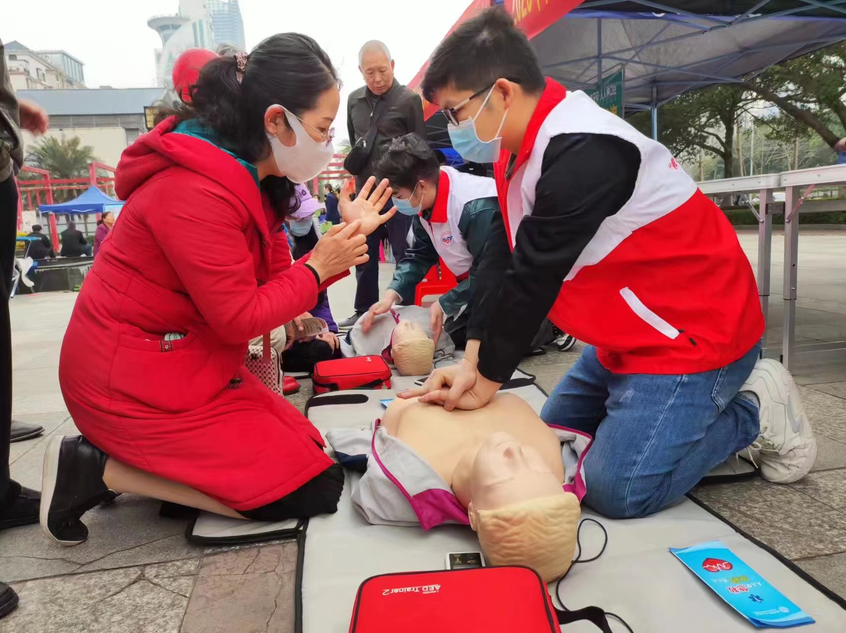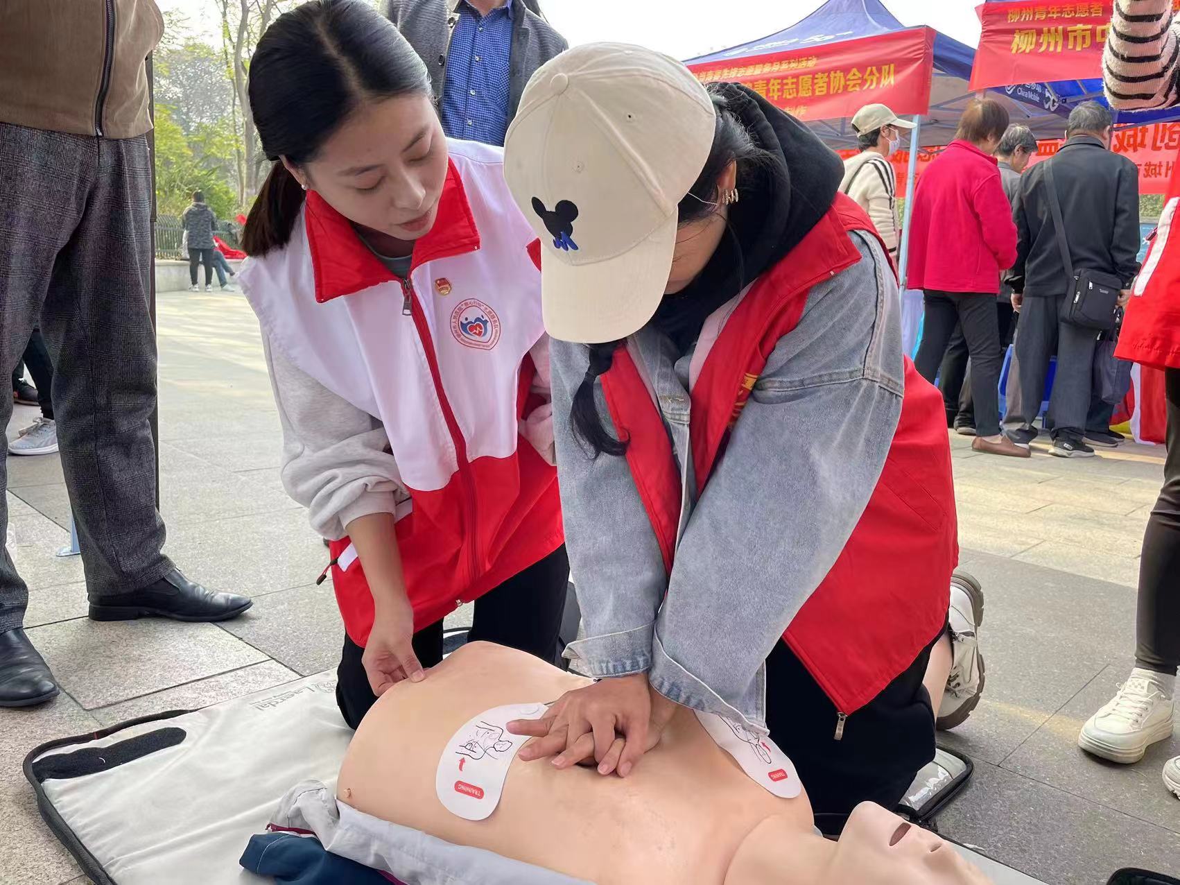 “救心行动”是柳州市人民医院近年来重点打造的志愿服务品牌,旨在向全社会宣传推广心肺复苏术和AED(自动体外除颤仪)使用,帮助群众提升急救能力和生命质量。自2021年项目创建以来,已深入全市各机关企事业单位、学校、火车站、社区、大型商场、广场等区域开展培训活动41场,培训群众6400余人,得到新华社、中国政府网、《广西日报》《柳州新闻》等各类媒体宣传报道。在今年的学雷锋纪念日前后,该项目志愿者分别来到柳州火车站雷锋广场、雀山公园红豆广场、南亚社区孔孟广场,受邀参加由市委宣传部、市委文明办主办的2023年全区学雷锋志愿服务月示范活动,团市委主办的2023年第五届“小紫荆”青年公益志愿文化节,南亚社区主办的学雷锋志愿服务活动,在活动现场为群众宣传、讲解心肺复苏术和AED知识,利用教学模拟人实践操作心肺复苏术和AED使用,培训群众150余人,发放宣传资料200余份,在全区学雷锋志愿服务月示范活动和“小紫荆”青年公益志愿文化节这两场最具影响力的学雷锋示范活动上集中展现出医院志愿者的优良风貌,得到现场领导的高度评价和周边群众的广泛认可。